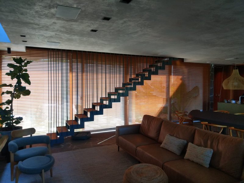 O uso de Persianas Horizontais (50mm), especialmente motorizadas, como divisão de ambientes, vem se tornando uma opção criativa e muito apreciada por arquitetos e designers de interiores. Essa escolha considera diversas vantagens em relação a uma parede fixa.